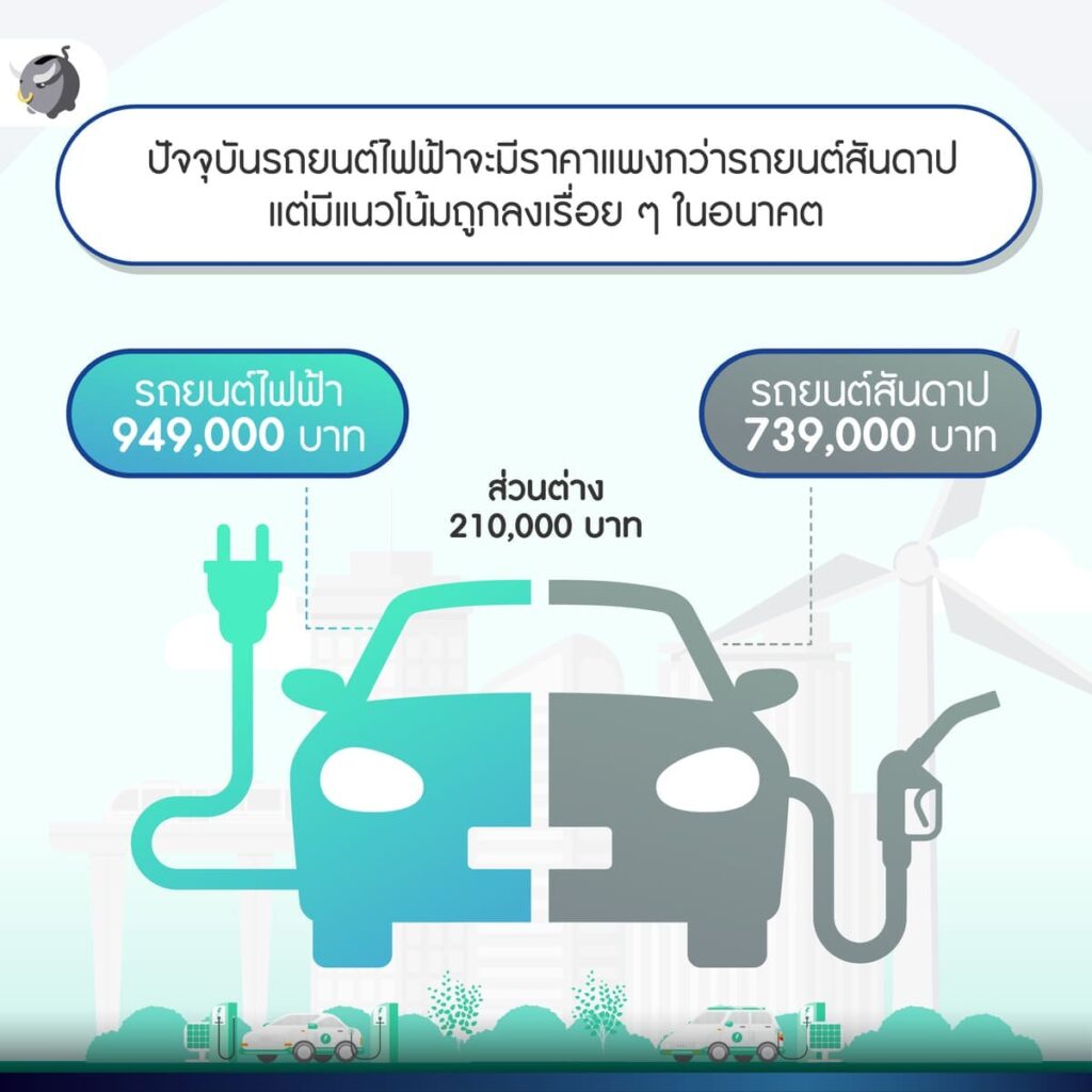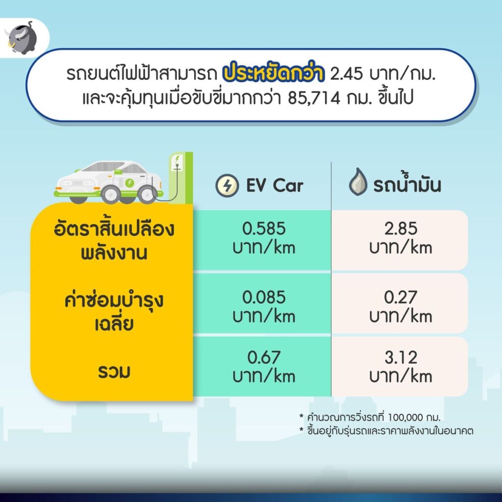 ซึ่งแปลว่าถ้านับรวมค่าพลังงานและค่าซ่อมบำรุงต่อ 100,000 กิโลเมตรแล้ว “รถยนต์ไฟฟ้า” จะประหยัดกว่า 2.45 บาท/กิโลเมตร