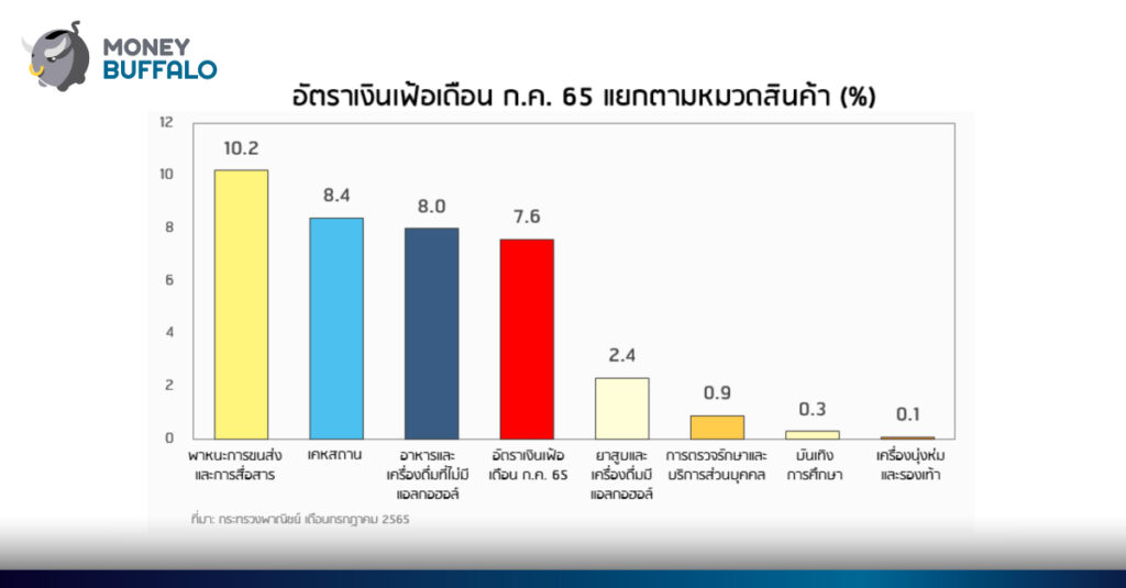 สำหรับรายละเอียดของเงินเฟ้อในเดือน ก.ค. 2565 ที่ 7.6% แยกตามทั้ง 7 หมวดในตะกร้าเงินเฟ้อ จากภาพด้านล่าง จะเห็นว่า เงินเฟ้อของสินค้าแต่ละหมวดเพิ่มขึ้นไม่เท่ากัน