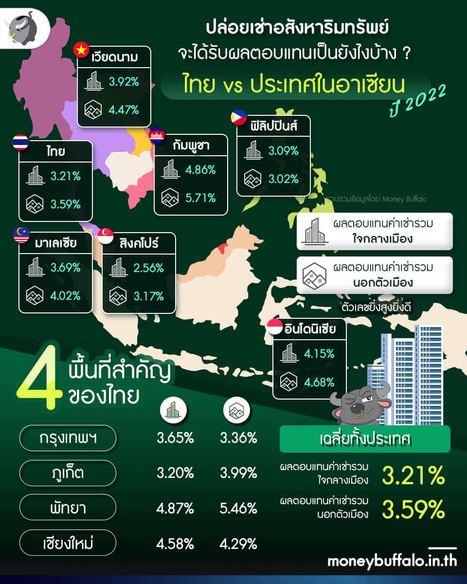 • ถ้าเทียบกับประเทศอาเซียนด้วยกัน ผลตอบแทนค่าเช่ารวมของไทย เป็นรองกัมพูชา อินโดนีเซีย เวียดนาม มาเลเซีย แต่สูงกว่า ฟิลิปปินส์ และสิงคโปร์