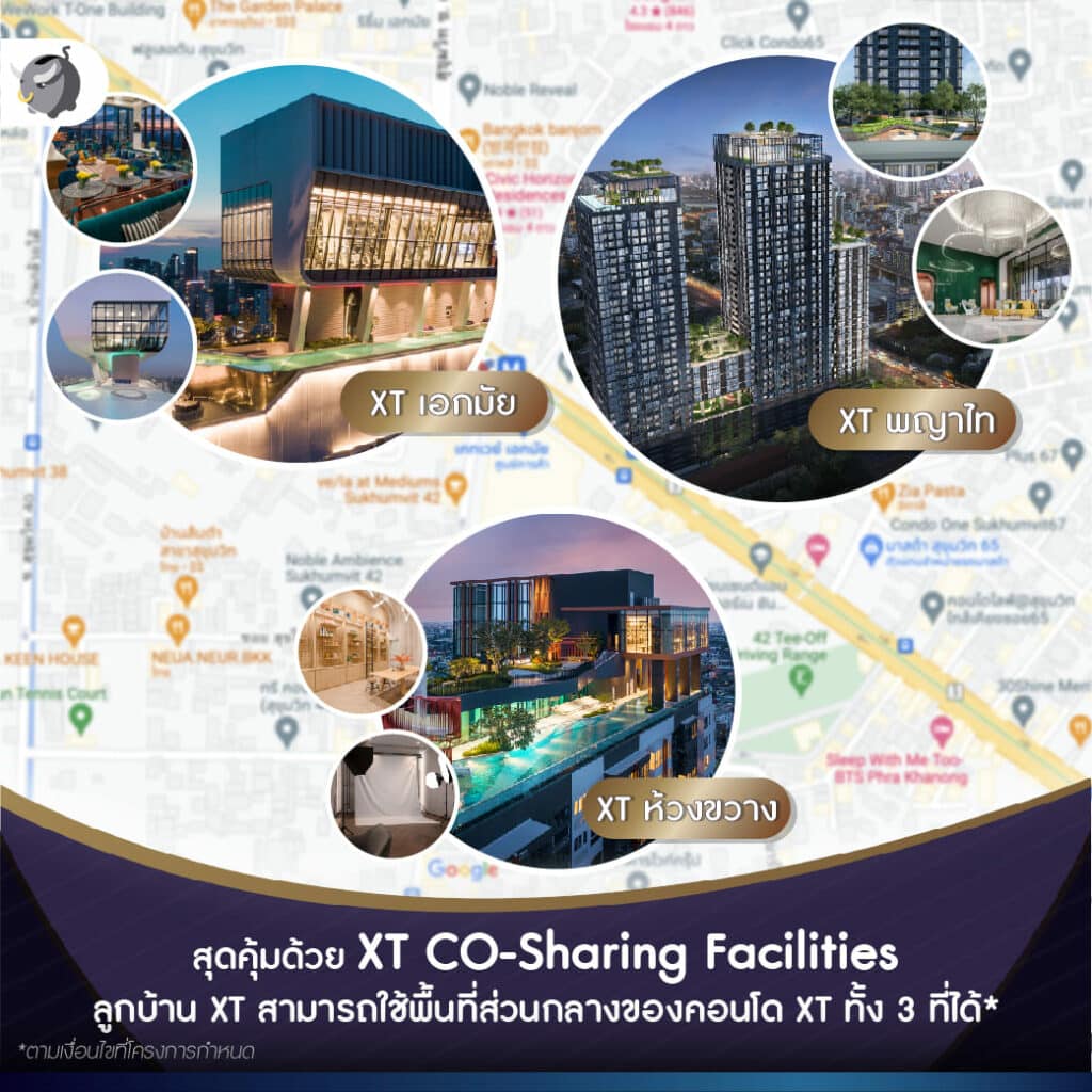 อีกหนึ่งจุดเด่นที่พี่ทุยว่าน่าสนใจ และแตกต่างจากคอนโดอื่น ๆ คือ “XT CO-Sharing Facilities” หรือการที่ลูกบ้าน XT ทั้ง 3 โครงการสามารถใช้พื้นที่ส่วนกลางของ XT ได้ทั้ง 3 ที่* ซึ่งคอนโด XT ในแต่ละที่ ก็จะมีจุดเด่นที่ไม่เหมือนกัน อย่างเช่น