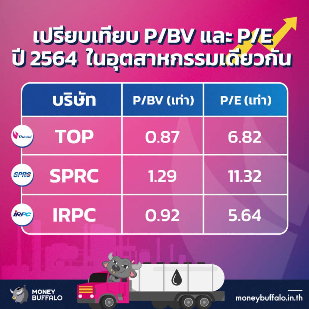 P/BV Ratio ปรับตัวลดลงอย่างมีนัยสำคัญ เนื่องจาก บริษัทฯ อยู่ระหว่างลงทุนโครงการ CFP ทำให้กระแสเงินสดช่วง 2 ปีข้างหน้าตึงตัว ด้วย P/BV ที่ต่ำกว่า 1 บ่งบอกว่าราคาปัจจุบันของหุ้นนั้นต่ำกว่ามูลค่าทางบัญชีต่อหุ้น กล่าวคือในราคาปัจจุบัน นักลงทุนจ่ายเงินเพื่อเป็นเจ้าของหุ้นตัวนั้นต่ำกว่าเจ้าของนั่นเอง